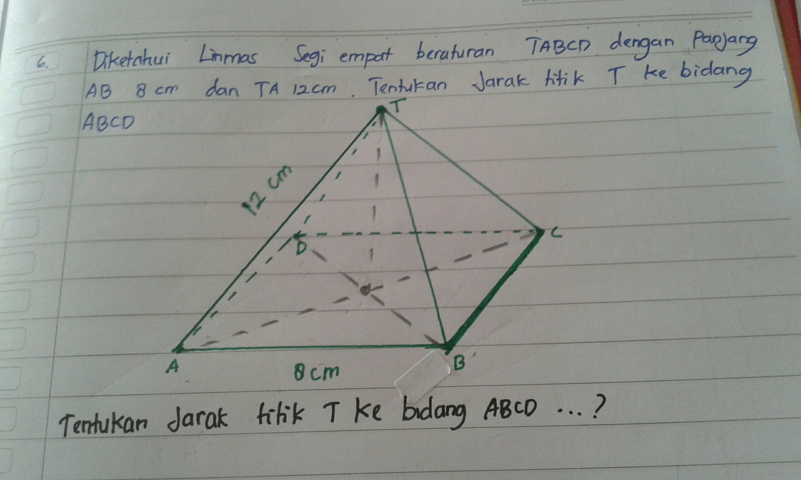 Diketahui Limas Segiempat Beraturan T.abcd, Jika Panjang Ab = Ta = 6 Cm, Maka Tinggi Limas Adalah / Diketahui Limas Segi Empat Beraturan T Abcd Dengan Panjang Rusuk Alas 6 Cm Dan Tinggi 4 Cm Jika Titik O Titik Tengan Abcd Jarak Titik O Ke Bidang Tbc Adalah Rebbosetau - Diketahui limas segi empat beraturan t.