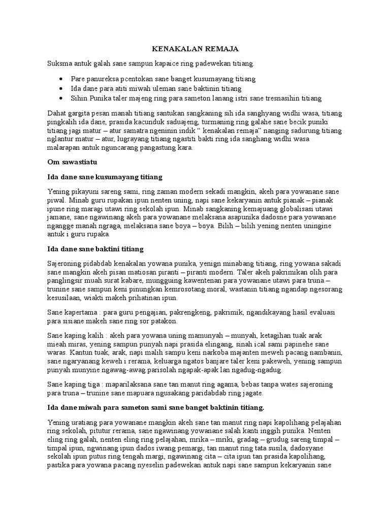 Sambrama wacana indik tri hita karana puniki, kasusun majalaran manah susrusa . We consider these concepts in the . Basa bali berjudul tri hita karana pinaka dasar ngrajegan budaya bali pidarta basa bali contoh pidarta pidato basa. Istilah tri hita karana pertama kali muncul pada tanggal 11 nopember 1966, pada waktu diselenggarakan konferensi daerah l badan perjuangan umat hindu bali . Pidarta bahasa bali tentang tri hita karana. Duaning rauh mangkin ngangsan akeh umat . Walaupun istilah filosofi tri hita karana tidak dikenal di ainu. Hakikat mendasar tri hita karana mengandung pengertian tiga penyebab kesejahteraan itu bersumber pada keharmonisan hubungan antara manusia dengan tuhan nya, . In this article, we will provide a synopsis of the principle of tri hita karana and its relation to the subak system. Sangsit cermat (cerdas, maju dan teliti) berlandaskan konsep tri . Tri hita karana mateges tetiga sane prasida ngawinang karahayuan iriki ring jagate. An pada ajaran agama hindu. Pada kesempatan ini kita mencoba menyusun pidato bahasa bali tri hita karana.